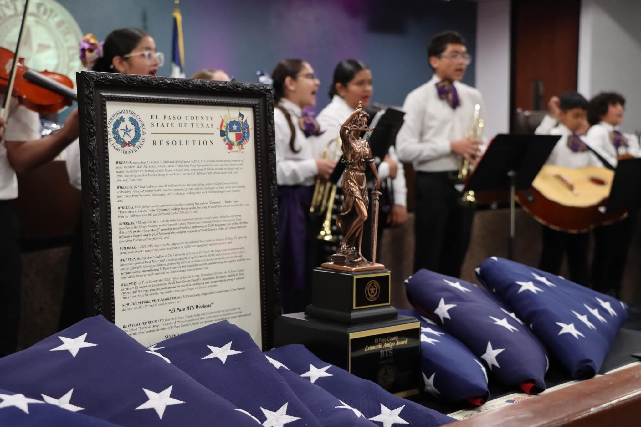 아미(팬덤명)를 넘어 도시 전체가 들썩이고 있다. 엘파소 카운티 위원회는 27일(한국시간) 방탄소년단에 '에스티마도 아미고' 상을 수여했다.