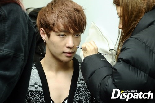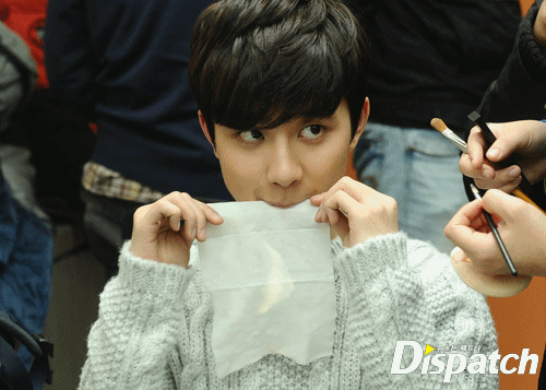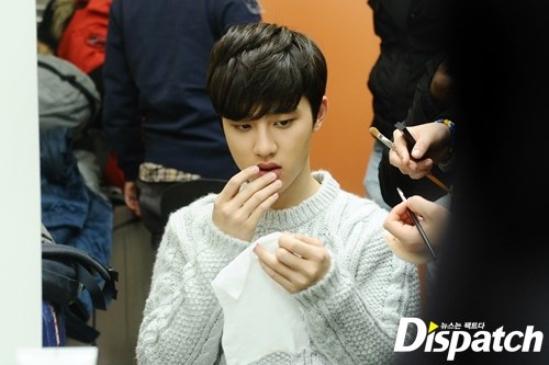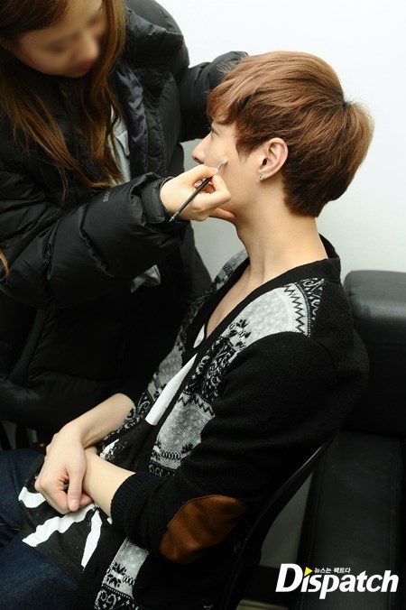 대기실의 엑소들은 '꽃단장'에 한창입니다. 우선 꿀피부 사수입니다. 스타일리스트의 손을 빌려 꼼꼼하게 점검합니다. 잡티 하나까지 놓칠 수 없다는 레이의 강렬한 눈빛, 보이시나요. '하트 입술'로 유명한 디오의 입술 관리법은 남다릅니다.