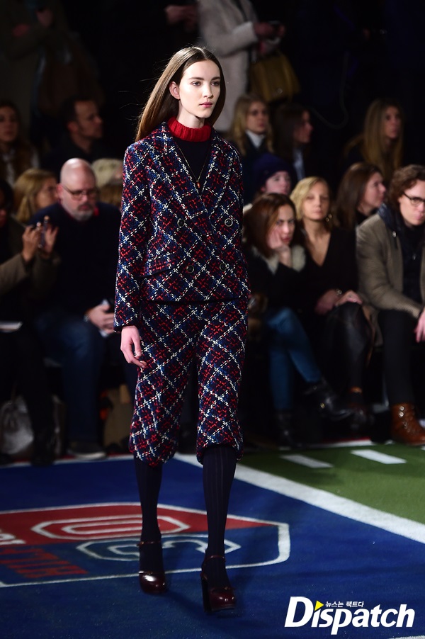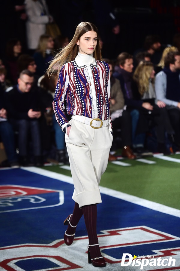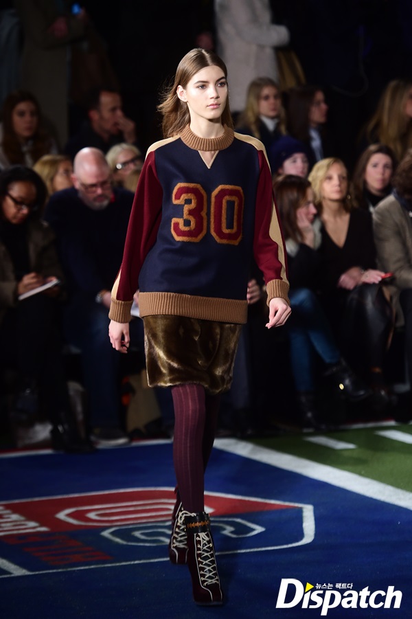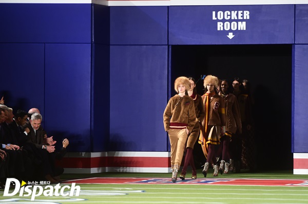 디자이너 힐피거는 자신의 30주년을 기념해 콜렉션 무대를 스타디움으로 만들었습니다. '런웨이'를 필드로, '프론트로'를 벤치로 꾸몄습니다.