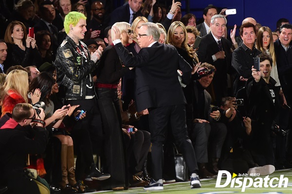 힐피거는 헬멧을 들고 나와 관객들의 환호에 화답했습니다.