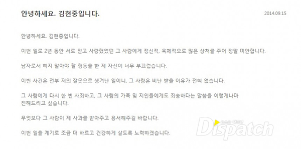 2014년 9월 : 김현중, '현중닷컴'을 통해 사과문 발표