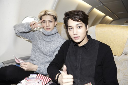 '엑소'는 포즈로 승부했습니다. 카이는 엄지손가락을 치켜 올렸고요, 세훈은 귀엽게 V를 해봅니다. 아, 세훈의 손에 들린 편지가 보이시나요? 공항에서 받은 팬레터를 챙겼는데요. 카이와 세훈은 비행기 안에서 팬레터를 읽으며 북경으로 향했습니다. 덕분에 지루하지 않았다네요.