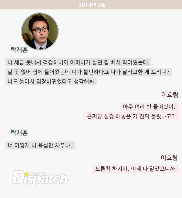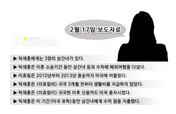 '디스패치'는 탁재훈의 통장거래 및 해외송금 내역을 입수했다. 또한 이효림이 미국에서 쓴 카드사용 내역도 파악했다. 상간녀 3명의 금전거래 및 비행기록도 확인했다.