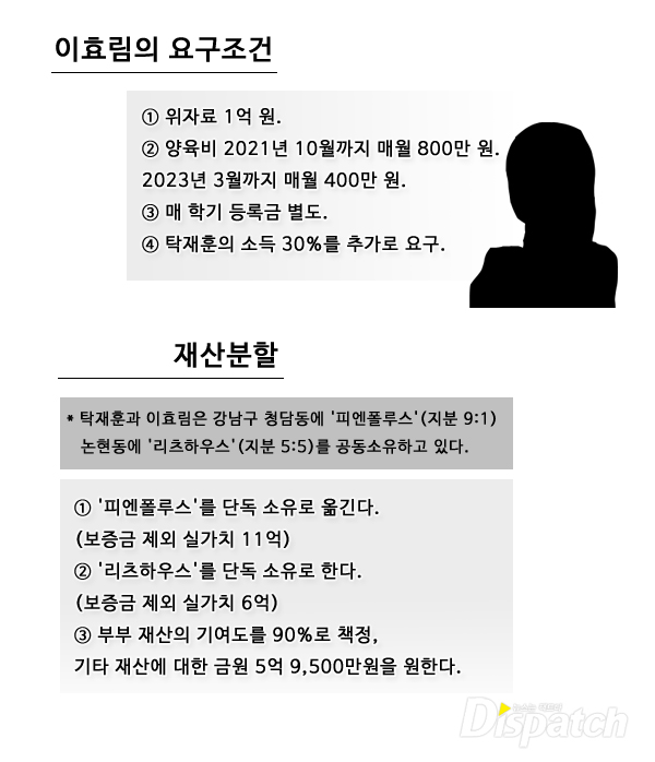 정리하면, 이효림은 공동명의의 부동산 전부를 자신의 명의로 이전할 것을 요구했다. 해당 부동산에 붙은 빚(근저당 및 기타 압류)은 탁재훈이 떠안는 조건이다.