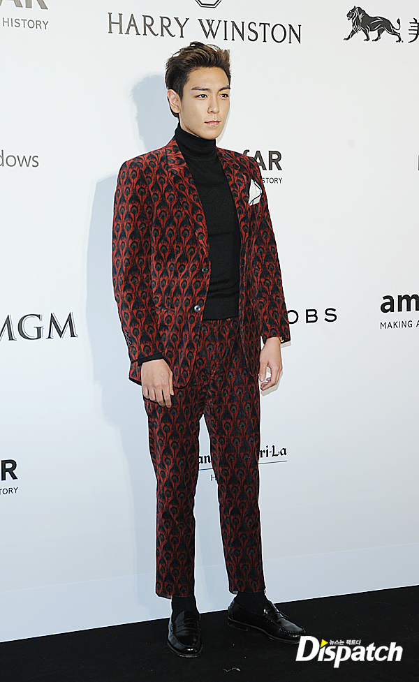 탑은 세련된 세미 정장을 소화했다. 특히 개성 넘치는 붉은색 패턴이 돋보였다. 이너웨어는 블랙 목폴라를 매치, 깔끔하게 마무리했다.