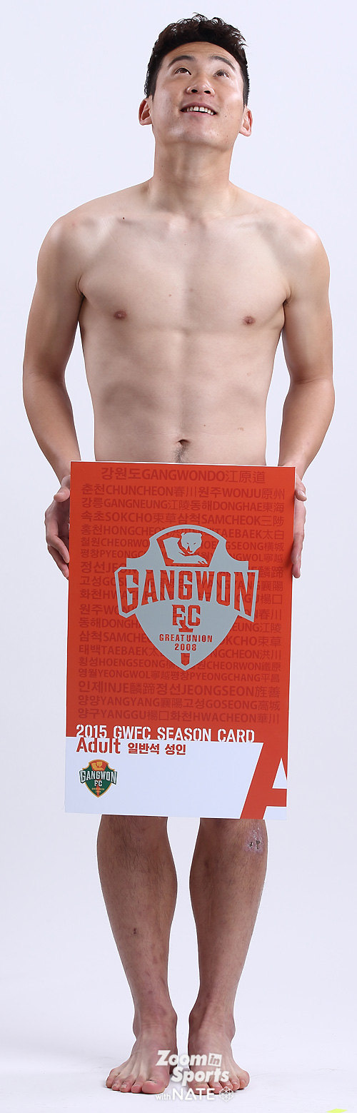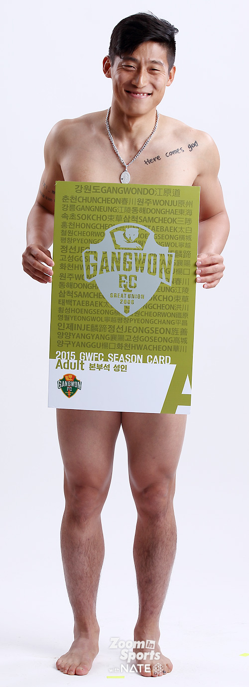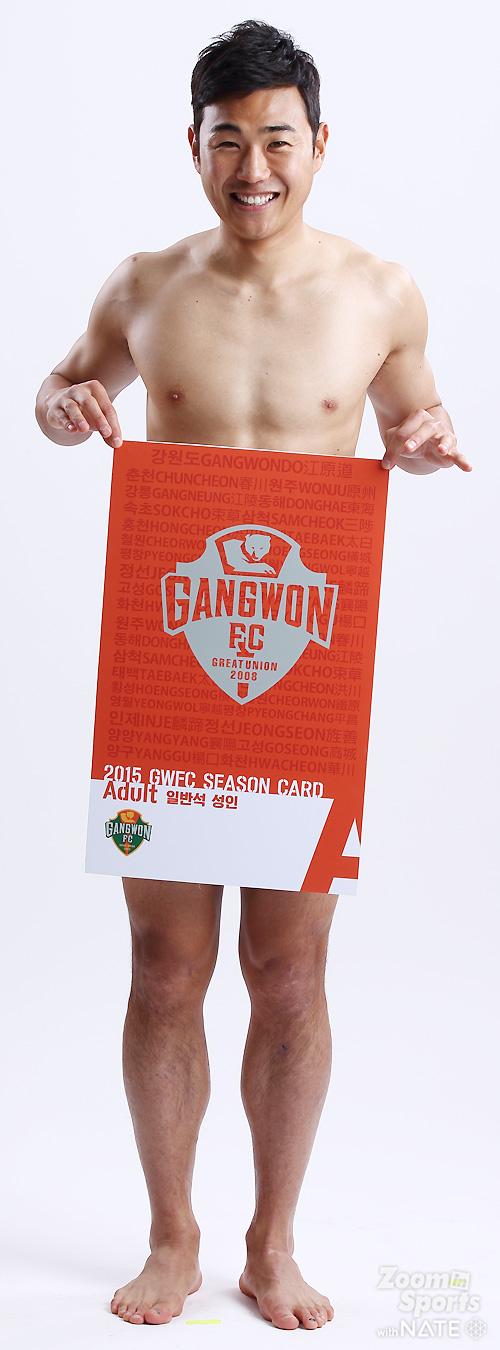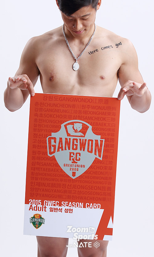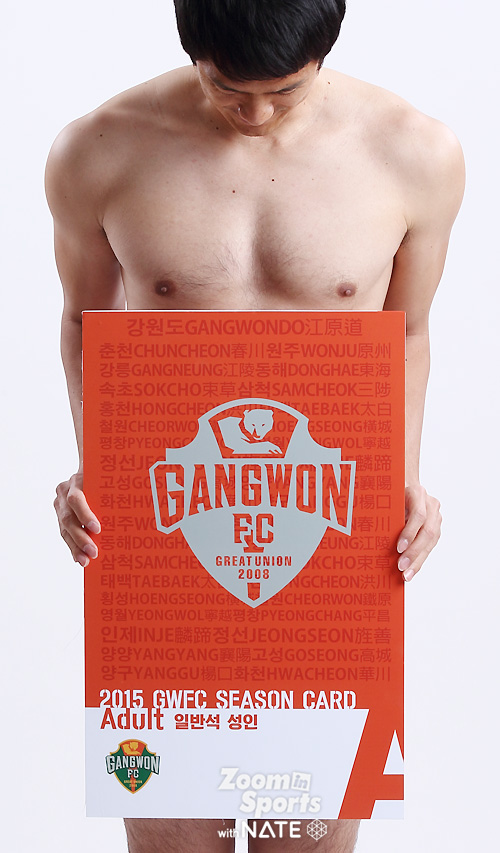 임은주 대표가 강조한, 강원FC 전직원 영업사원 프로젝트 '벗어, 다벗어!'가 순조롭게(?) 진행되고 있었다. 연간회원권판매에 적극 참여한 강원 선수들의 스튜디오 촬영컷이었다. 중요한 건, "벗을거면 속옷까지 다벗어!".