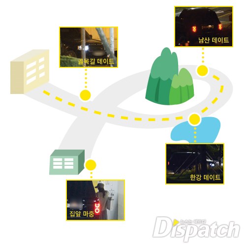 ▶Where : 데이트 장소는 100% 차 안입니다. 매번 이승기가 자신의 차인 레인지로버를 몰고 움직였습니다. 가장 애용하는 장소는 아파트 옆 골목길입니다. 간혹 한강이나 남산으로 드라이브를 갔지만, 역시나 차에서 내리지 않았습니다.