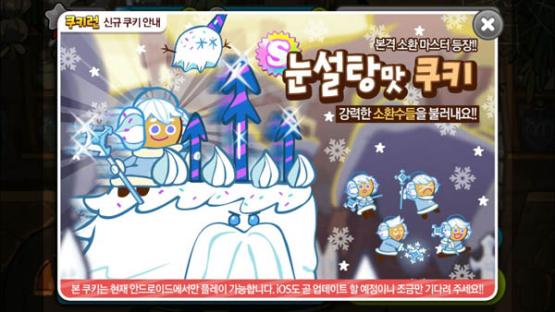 이 게임은 오븐을 탈출한 쿠키가 여러 장애물을 피하며 달린다는 설정으로 쿠키는 게임 내 캐릭터를 의미한다. 이번에 추가된 눈설탕맛 쿠키는 일정 시간마다 장애물을 부수고 눈꽃젤리를 생성하는 스노우콘 소환수를 소환하고 눈꽃젤리를 모으면 눈보라를 일으키는 스노우킹 소환수를 불러내는 능력을 갖고 있다.
