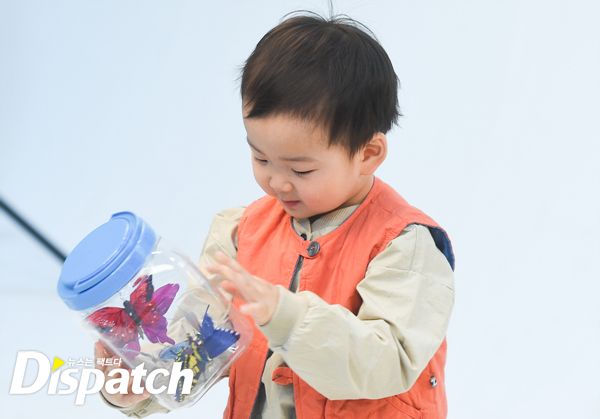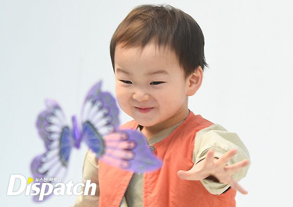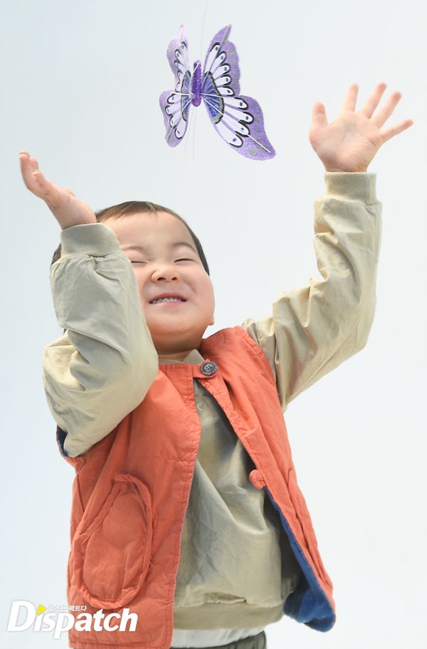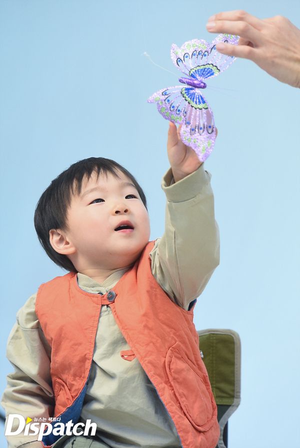 하지만 너무 의욕이 강했습니다. 자리에 앉아 카메라를 바라봐야 하는데, 대한이가 벌떡 일어나 나비를 덥썩 잡습니다. 아빠 송일국도 멋쩍은 웃음을 짓습니다.
