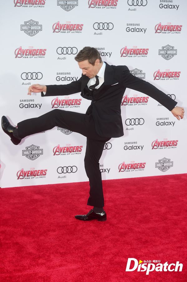 제레미 레너는 역시 액션스타였다. 포토월에서 강렬한 눈빛을 선보여 플래쉬 세례를 받은 것. 이 뿐 아니다. 레드카펫 위에서 발차기를 하거나, 주먹을 내지르는 등 직접 액션신을 연기해 눈길을 끌었다.