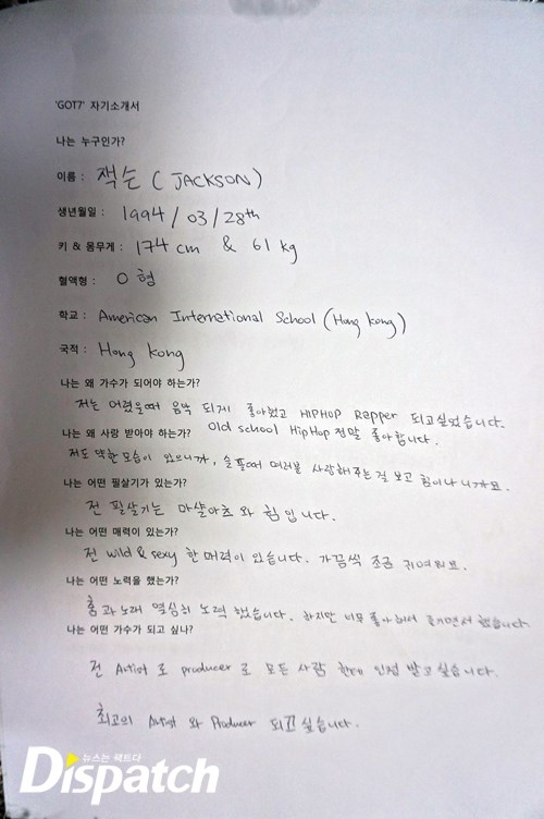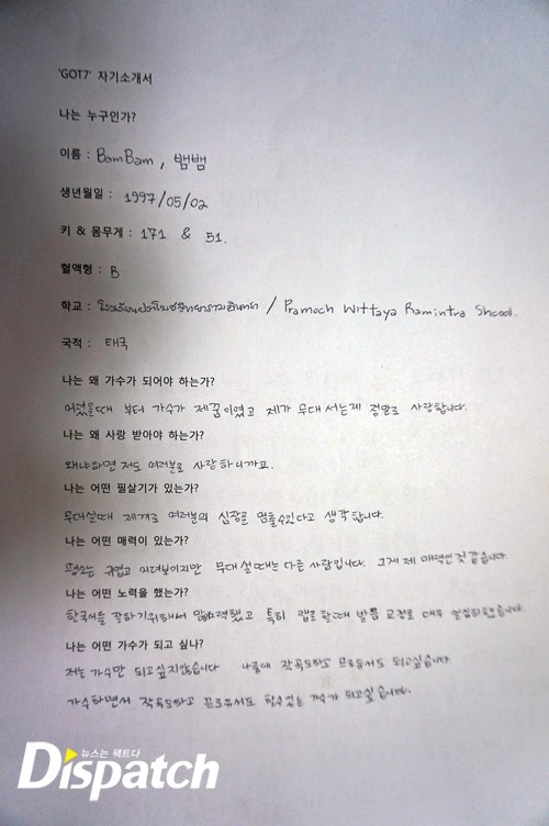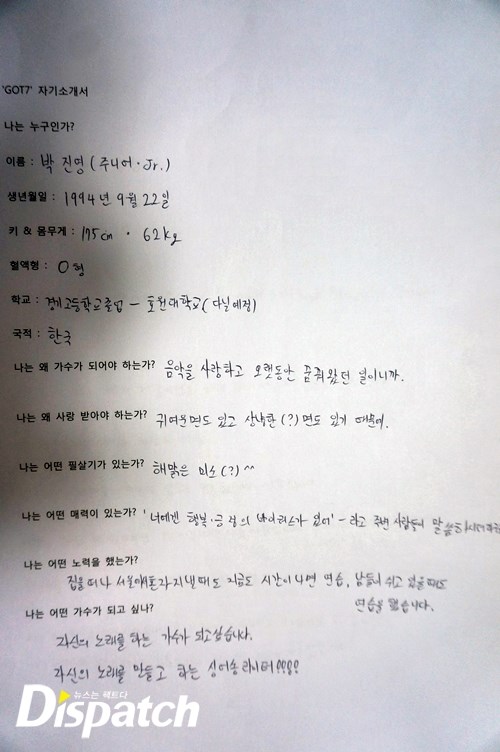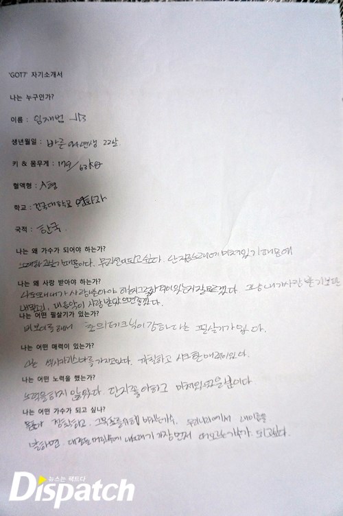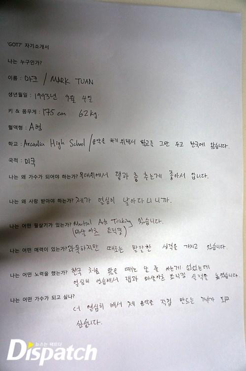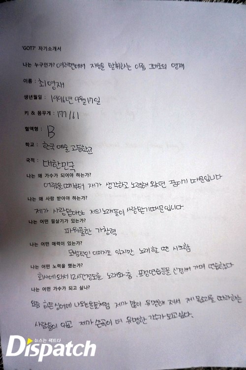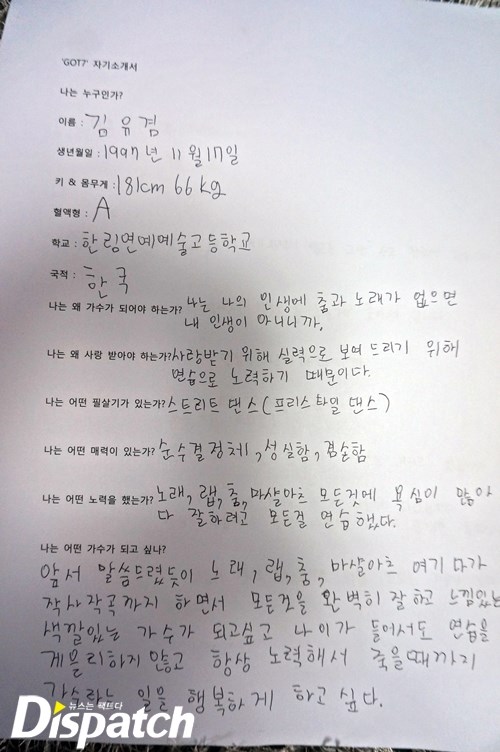 이제 막 '갓세븐'에 입문한 소녀 팬들을 위해 준비했다. '갓세븐'이 직접 쓴 자기 소개서다. 총 7가지 질문을 던졌고, 답을 들었다. 멤버 각각의 개성이 담긴 삐뚤삐뚤 귀요미 글씨체는 덤. '갓세븐'의 매력에 빠져보자~.