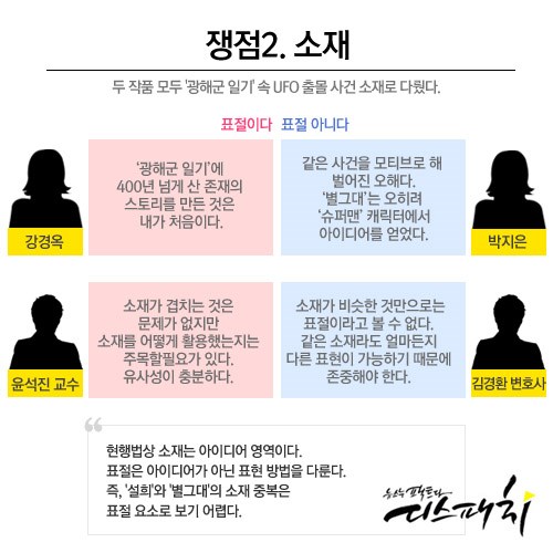 ② 강경옥을 지지하는 쪽은? : 역사적 기록을 바탕으로 드라마를 만들 때는 앞선 작품을 조사하는 게 기본이다. 국내에서 광해군 일기 속 UFO를 다룬 작품은 단 5개 뿐. '별그대' 측이 '설희'의 존재 자체를 아예 몰랐다는 주장은 쉽게 납득하기 어렵다. (충남대 윤석진 교수)
