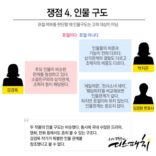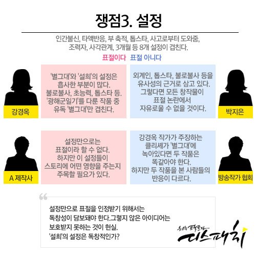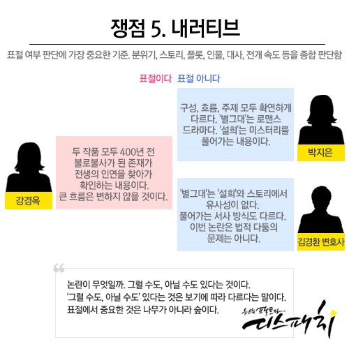 ④ 박지은의 주장을 지지하는 쪽? : '별그대'는 '설희'와 스토리에서 유사성이 없다. 전혀 다른 이야기를 하고 있다. 게다가 풀어가는 서사 방식도 다르다. 이런 경우, 판례를 참고해도 표절로 보기 힘들 것 같다. 이번 논란은 법적 다툼의 문제는 아니다. (김경환 변호사)