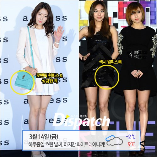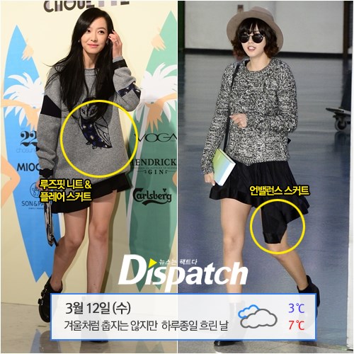 제안 ① 니트 & 스커트 : 여대생이라면 캐쥬얼 룩도 도전해 보세요. '에프엑스' 빅토리아처럼 루즈한 니트에 플레어 스커트를 매치하는 겁니다. 손에는 무심하게 빅 사이즈 클러치를 들어 주세요. 스타일리시해 보일 겁니다.