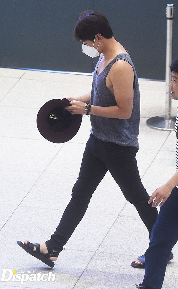 비는 회색 민소매 셔츠에 블랙 팬츠를 매치했다. 김태희와 마찬가지로 마스크로 얼굴을 가렸다. 손에는 와인색 페도라가 들려 있었다.