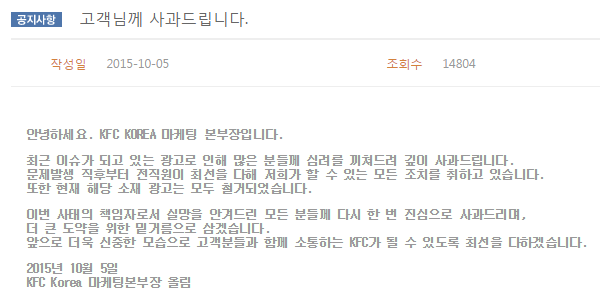 KFC는 5일 공식 홈페이지에 사과문을 게재했습니다. 이들은 "최근 이슈가 되고 있는 광고로 인해 많은 분들께 심려를 끼쳐, 깊이 사과드린다"고 밝혔습니다.