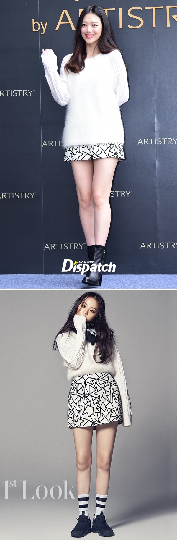 설리와 소희가 같은 앙고라 니트와 미니 스커트를 입었다. 설리는 지난 달 30일 한 브랜드 행사장에서, 소희는 패션지 '퍼스트룩' 9월호에서 선보였다.