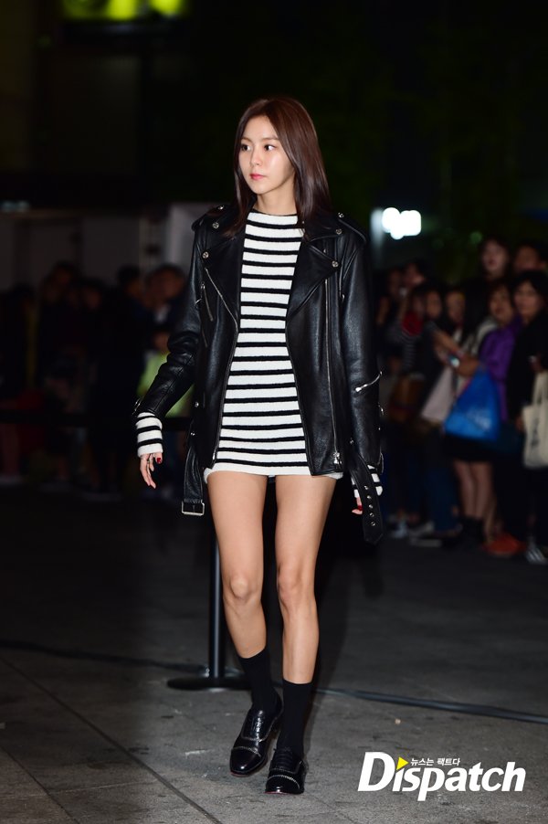 유이는 줄무늬 초미니 원피스와 단화로 군살없는 각선미를 뽐냈다.