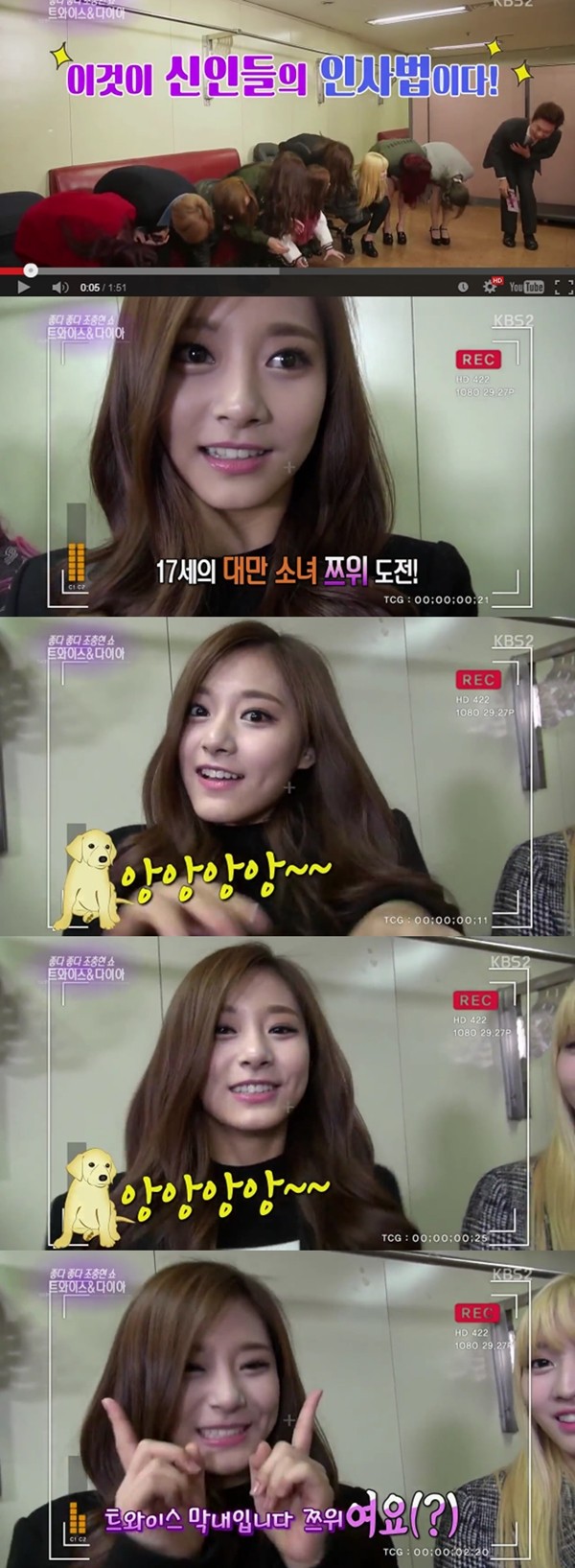 이날 필살기 애교를 공개했습니다. 다름아닌 강아지 흉내. 쯔위는 두 손을 흔들며, '앙앙앙앙'이라고 흉내 냈습니다.