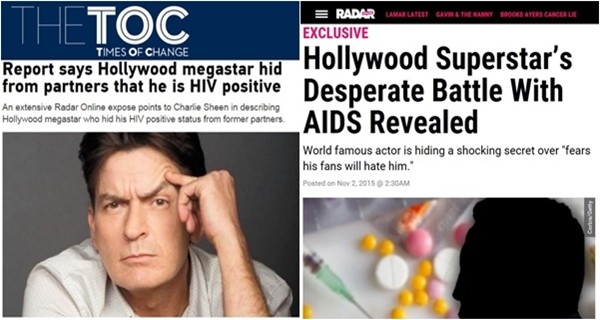 "찰리 쉰이 에이즈에 감염된 사실이 뒤늦게 알려졌다. (중략) 에이즈 스캔들의 주인공은 찰리 쉰이라고 12일(현지시간) 온라인 매체 '레이더'가 다수 소식통을 인용해 보도했다." (국내 매체)