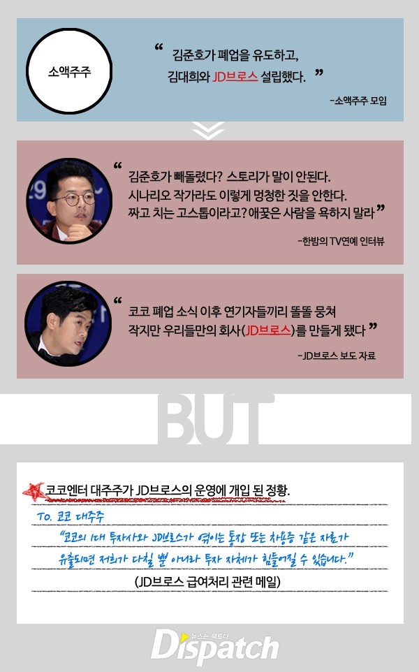 김준호와 김대희는 발, 아니 말을 맞췄다. 전혀 무관한 회사로 선을 그었다. 그러나 취재 결과, 코코엔터 대주주 측은 JD브로스의 운영에 깊숙히 개입돼 있었다.