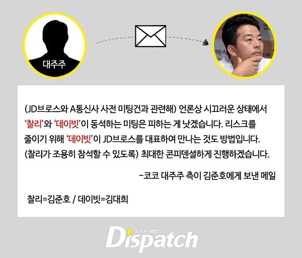 그러니 '디스패치'가 입수한 문건에 따르면, 그는 코코의 1대 투자자와 함께 그림을 그렸고, 지분을 논했으며, JD브로스를 지원했다.