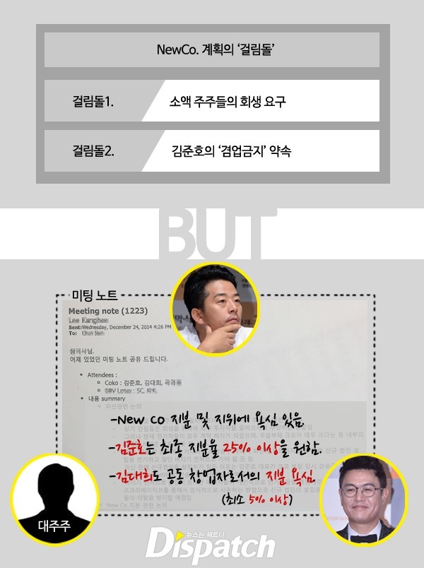 코코엔터 사태 1년, '디스패치'는 코코엔터 대주주와 개그맨 김준호의 '뉴코퍼레이션' 계획서를 입수했다. 정확히 1년 전인 2014년 11월 작성된 것이다.