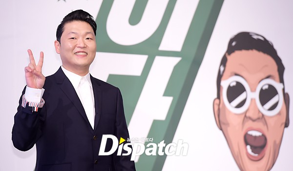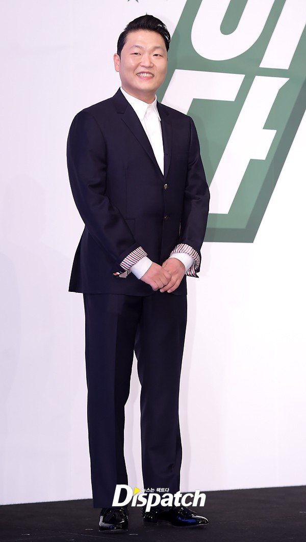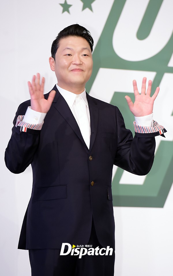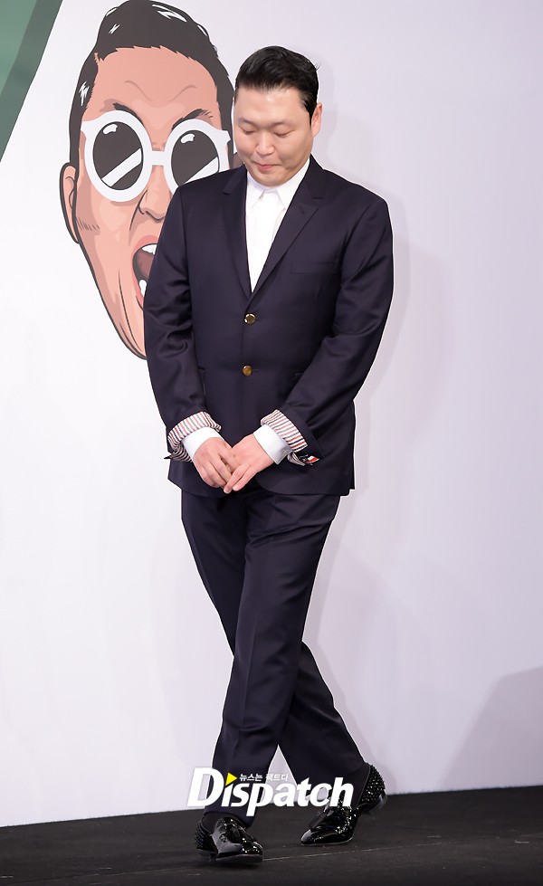 이날 싸이는 깔끔한 수트 차림으로 무대에 올랐다. 포토타임에는 브이와 양손 인사로 다양한 포즈를 취했다.