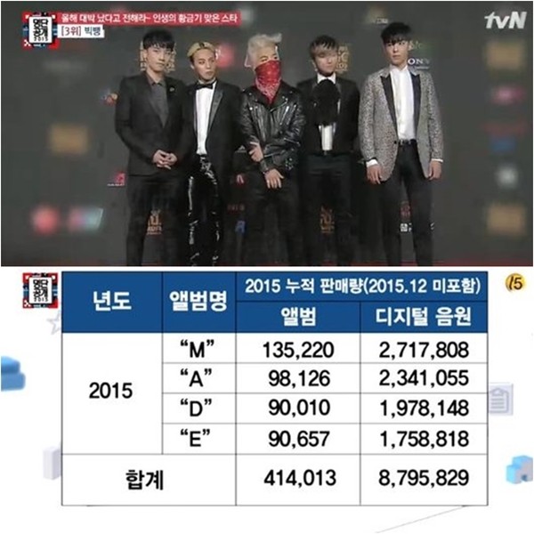 빅뱅은 14일 방송된 tvN '명단공개 2015'에서 '올해 인생 황금기를 보낸 스타' 순위 3위에 올랐는데요.