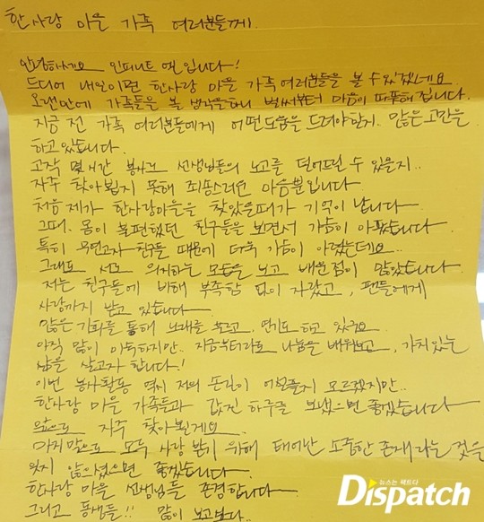 이날 엘은 한사랑 어린이들을 위해 개인적으로 500만원을 기부했습니다. 치료비에 써 달라는 당부와 함께요. 편지도 살며시 전달했습니다.