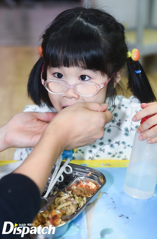 점심 시간입니다. 엘이 능숙하게 아이들에게 턱받이를 매 줬습니다. 여진이는 엘의 손길이 좋은 듯 웃음을 멈추지 않았습니다.