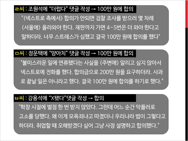 ③ '더럽게 논다' 또는 '더럽다'는 댓글로 고소를 당한 네티즌도 많았다. D***씨는 경찰 조사를 받았고, E***씨는 넥스트로와 합의를 했다.
