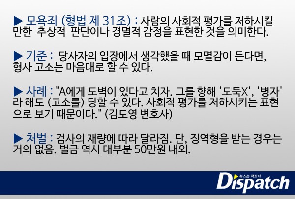 '디스패치' 취재 결과 ㅂ씨와 같은 의문을 품는 사람은 많았다. 하지만 당사자가 모욕 혹은 모멸감을 느꼈다면 언제든지 고소 가능한 게 대한민국 법이었다.