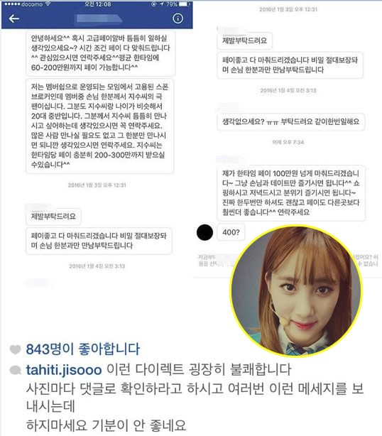 심지어 지수가 응답하지 않자, "400(만원)?"이라며 금액을 올렸다. 또, "데이트만 하면 된다. 쇼핑하고 저녁 먹고, 분위기만 즐기라"고 유혹하기도 했다.