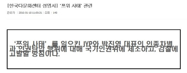소수자의 인권을 옹호하고 다문화 사회 실현을 위해 노력하는 (사)한국다문화센터는 이번 ‘쯔위사태’를 심각한 인종차별과 인권침해 행위로 규정한다.
