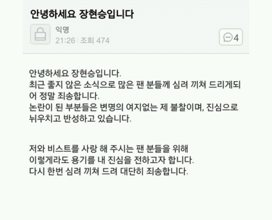 장현승은 23일 '비스트' 팬카페를 통해 짤막한 사과문을 올렸습니다. "좋지 않은 소식으로 심려 끼쳐드려 죄송하다"고 말문을 열었는데요.