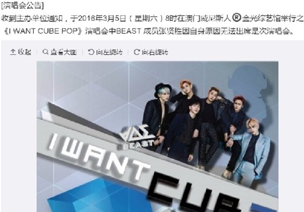 일본 예매 사이트 'CotaiTicketing' 측은 4일 웨이보를 통해 "장현승이 5일 열리는 '아이 원트 큐브 팝' 공연에 참석하지 못한다"고 밝혔습니다.