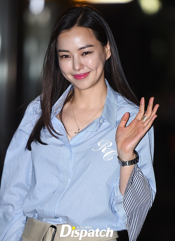 이하늬는 이날 베이지 초미니와 하늘색 셔츠를 매치해 봄스타일을 선보였다.
