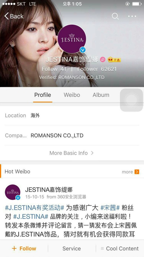 또한 J사가 운영하는 韓中 SNS에 송혜교 씨가 나오는 부분을 캡쳐해 바이럴 마케팅을 진행했습니다. 심지어 中웨이보에는 송혜교 씨를 자사 모델처럼 이미지화 시켜 홍보했습니다.