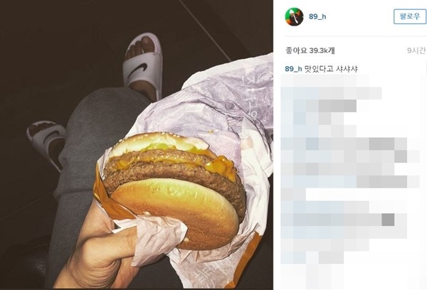 일상의 여유가 느껴졌습니다. 편한 트레이닝복 차림에 슬리퍼를 신고, 햄버거를 먹었습니다.