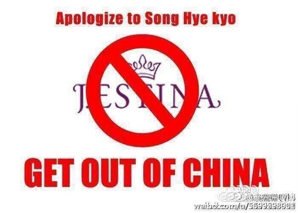 심지어 J사 반대 포스터도 확산되고 있다. "송혜교에게 사과하라(Apologize to Song hyo)", "중국에서 내보내자"(Get out of China) 등이 적혀있다.