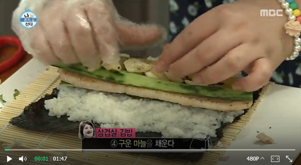 이날 이국주는 김밥을 준비했습니다. 그런데 재료부터 남달랐습니다. 삼겹살, 구운 마늘, 오이, 단무지 등을 사용했는데요.