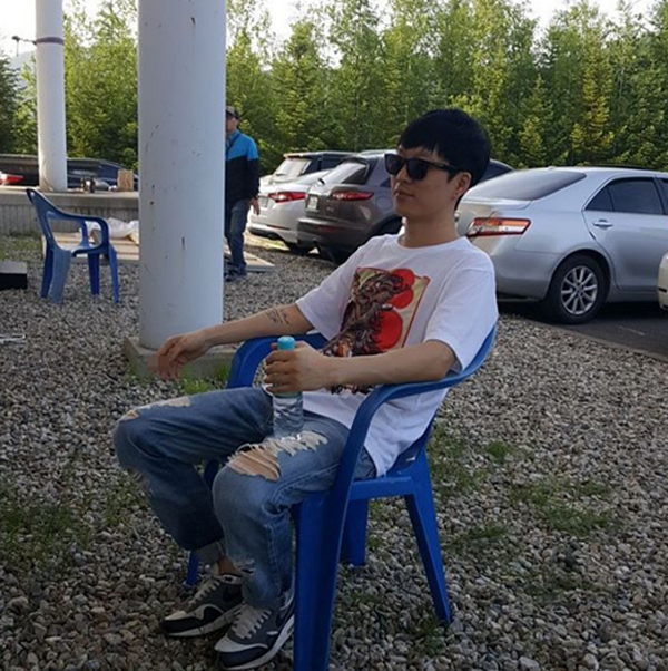 로커의 일상은 여유가 넘쳤습니다. 하현우는 리허설 중, 야외 의자에 앉아 휴식을 취하고 있었습니다.