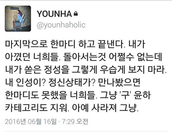 "내 인성이? 정신상태가? 만나봤으면 한마디로 못했을 너희들. 그냥 ‘구’윤하 카테고리도 지워. 아예 사라져 그냥."