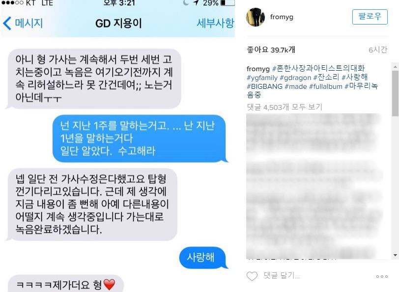 내용이 어쨌든, 마무리는 훈훈했습니다. 양현석은 "사랑해"라고 보냈고요. 지드래곤은 "제가 더요 형"이라고 하트 이모티콘까지 붙였습니다.