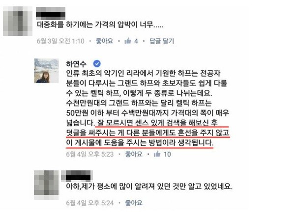 그러나 하연수는 예민한 태도를 보였습니다. "인류 최초의 악기인 리라에서 기원한 것이 하프"라며 말문을 열었는데요. 네티즌에게 가격대의 폭이 넓다고 알렸습니다.