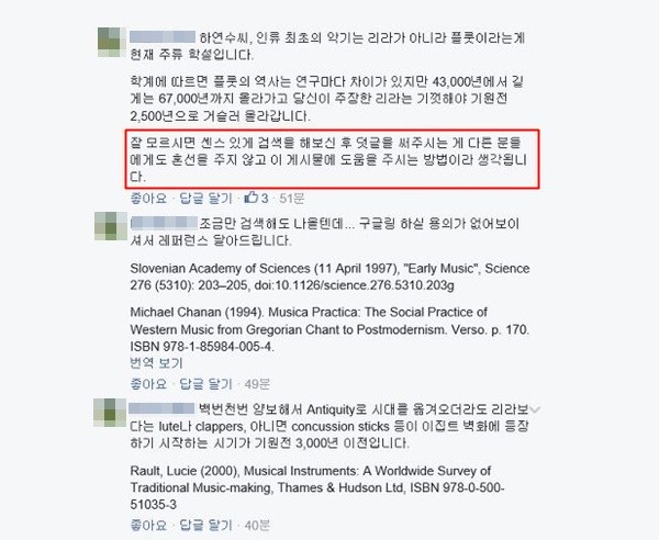 이를 본 한 네티즌은 하연수의 말투를 따라하며 비꼬는 댓글을 게시했습니다. 그는 인류 최초의 악기는 리라가 아니라 플룻이라고 지적했습니다.