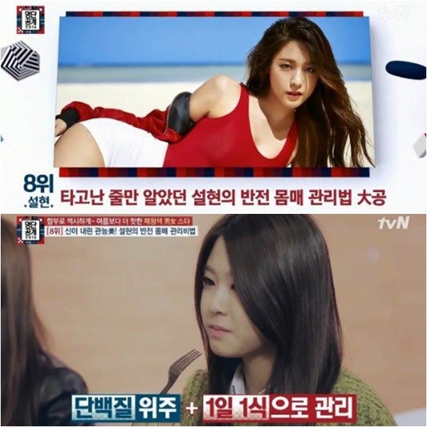 'AOA' 설현은 8일 방송된 tvN '명단공개 2016'에서 '패왕색 스타' 8위에 올랐습니다. '명단공개' 측에 따르면, 설현은 현재 167cm에 48kg입니다.