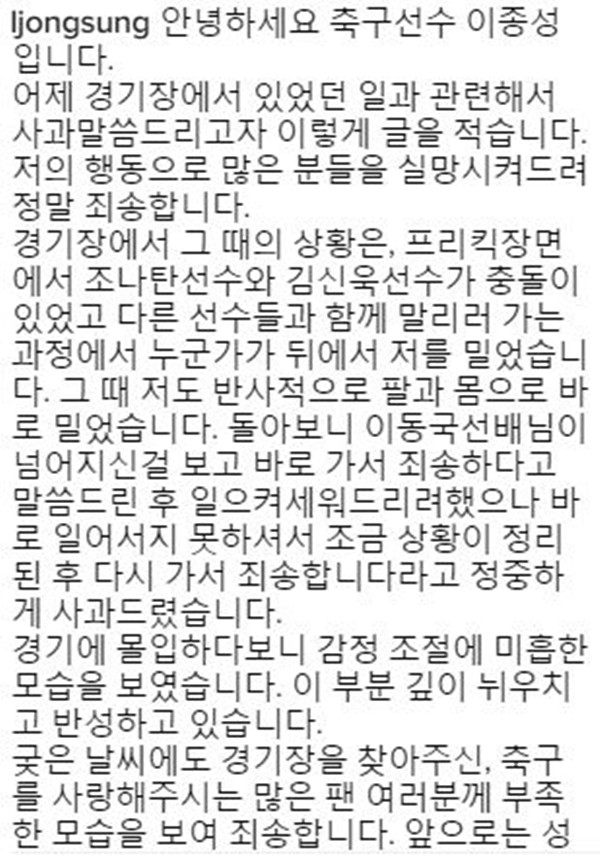 이종성(24·수원삼성)이 경기 중 이동국(37·전북현대)을 밀친 것에 대해 사과했습니다. 19일 SNS에 사과문을 올렸습니다.