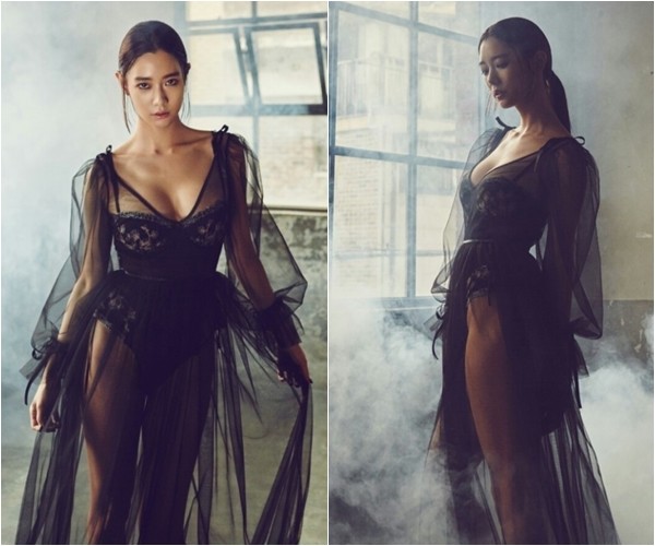 윤은혜는 검정색 레이스 장식이 된 브래지어를 입었습니다. 아찔한 가슴골이 시선을 끕니다. 여성스러운 매력이 돋보입니다.